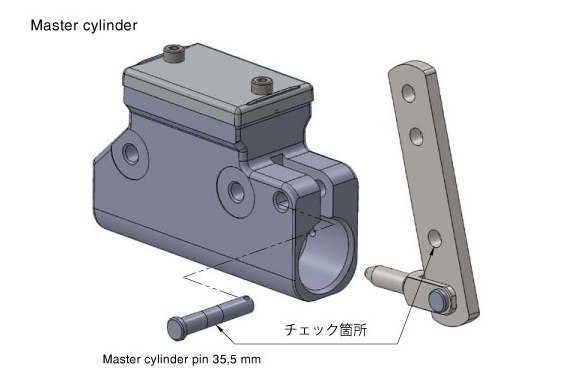 上記ブレーキディスクローター同様に、使用していると各部の磨耗が進行します。ガタが多すぎるとブレーキ性能に障害が出る可能性があります。 マスターピン、及びマスターレバーの確認を定期的に行ってください。 また必要に応じて部品の交換を行ってください。
